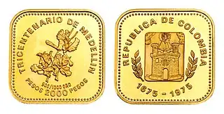 Both coins are of the same design, only the size and face value vary, they are made in gold law 0.900, are square in shape, and have the values of 1,000 and 2,000 Colombian pesos. The coin of the first value has a dimension of 17.5 x 17.5 mm and weighs 4.25 grams, and the second has 21 x 21 mm and weighs 8.5 grams.[31] On the obverse, the central figure is the "Coat of Arms of Medellín" flanked by olive branches; around the coat of arms, on the upper part is the legend "REPÚBLICA DE COLOMBIA" and on the lower part the years "1675 - 1975". On the reverse, the central figure is a bouquet of orchids, around it is the legend "TRICENTENARIO DE MEDELLÍN" at the top, and at the bottom is the value in letters and numbers, and "900/1000 ORO" indicating the purity of the metal.[31] A total of 8,000 pieces were minted, of which half were for 1,000 pesos and the rest for 2,000 pesos.[32] They are also the only two square-shaped Colombian coins.