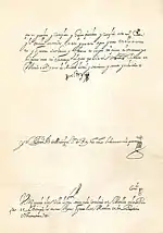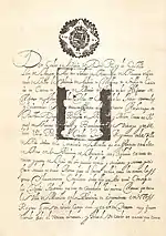 | Reproduction of the Royal Decree.[16] This document that arrived to the Villa de la Candelaria de Medellín was a copy of the Decree, since at that time the original document with the signature and seal of the King remained in Spain, and a copy was sent to the Indies. | ||