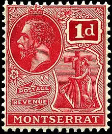 The colours and objects on the coat of arms carry cultural, political, and regional meanings. The woman wearing a green dress is Erin, the national personification of Ireland.[7][8] The Celtic harp she is clutching is another representation of that country.[9] Both these symbols allude to the Irish settlers who immigrated to Montserrat from 1632 onwards.[1][6] The first census conducted in the British Leeward Islands in 1678 found that 70% of the island's white residents claimed Irish ancestry, marking the highest concentration of Irish inhabitants in the federation.[8] The cross recognises the Christian heritage of the island,[6][upper-alpha 1] while the woman's embrace of it symbolises the Montserratians' love of Christ.[11]