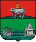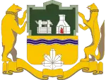 The coat of arms of Yekaterinburg (Russian: Герб Екатеринбурга) is the official municipal coat of arms of Yekaterinburg, Russia. The current symbol was adopted on 23 May 2008 and consists of a French shield divided horizontally into two fields, with a white mine shaft and a white furnace within the top field, which is green, and a blue wavy bend within the bottom field, which is gold. A gold bear and gold sable are located to the left and right of the shield, respectively. A gold crown with a gold laurel wreath is located above the shield and a gold ribbon is located below the shield. A grey druse is located at the bottom center of the shield.