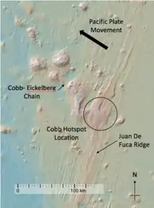 The Cobb hotspot is a marine volcanic hotspot at (46˚ N, 130˚ W),[1] which is 460 km (290 mi) west of Oregon and Washington, North America, in the Pacific Ocean. Over geologic time, the Earth's surface has migrated with respect to the hotspot through plate tectonics, creating the Cobb–Eickelberg Seamount chain. The hotspot is currently collocated with the Juan de Fuca Ridge.