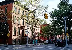 The historic district – first designated by the New York City Landmarks Preservation Commission (NYLPC) on December 20, 1969[3] and extended on June 7, 1988,[9] – is roughly bordered by Atlantic Avenue to the north, Court Street to the east, Degraw Street to the south, and Hicks Street to the west, with a "bite" removed from the northeast corner of that rectangle.[8][10] Its area measures approximately twenty-two city blocks. According to the NYLPC, the Cobble Hill Historic District is an "unusually fine 19th century residential area" and "retains an aura of the past with its charming streets and architecture".[3] The Cobble Hill Historic District was listed on the National Register of Historic Places in 1976.[11]