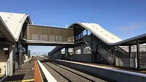 Cobblebank has two side platforms. The station has a ticketing office, an office and holding cell for Protective Services Officers, a waiting room, male, female and accessible toilets, a Parkiteer bicycle parking cage, an accessible pedestrian overpass with lifts, ramps and stairs, and bus and car parking.[16] The station has provision for two express railway tracks,[17] which will most likely be laid after electrification works to Melton are complete.[18]