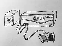 The equipment used for coblation tonsillectomy consists of a radio frequency (RF) generator, foot pedal control, irrigation system, and a tonsil wand. The generator provides radio frequency, which is essential for the procedure, and connects the foot pedal system to the tonsil wand. The foot pedals are colour coded to prevent confusion: one is yellow and is used for controlling the coblation, while the other is blue and used for controlling the radio frequency cautery. The wand is connected to the RF generator so it can be controlled with the pedals. The wand consists of a base electrode and an active electrode, which have ceramic and flowing saline between them. The radio frequency current that is produced by the generator travels through the saline, breaking the molecular bonds and forming ions. This creates a plasma field around the electrodes, which is used for removing soft tissue. There should not be any smoke produced while the coblation wand is being used during the operation; if this occurs, it is a sign that ablated tissue has entered the coblation wand's electrode area. This means that the current is not able to break down the saline into ions properly, so smoke is produced. When this happens, the coblation wand needs to be cleaned out before using it again.