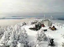 At 3,717 feet above sea level, the summit of Coburn Mountain is the highest groomed snowmobile trail in the state. Currently, the club responsible for the trail's upkeep and maintenance is the Coburn Summit Riders. The trail to the summit is 2 miles long, climbing 2,500 feet. The trail is divided into two sections with a spot to turn around in between. The first section to the radio repeater tower is groomed regularly and easily doable by any rider. The final one mile from the repeater tower to the top is recommended only for experienced snowmobilers. It is a narrow, winding, steep trail which is groomed only when conditions allow.[3] An abandoned fire tower remains on the summit providing clear 360 degree views of the area to adventurous hikers and snowmobilers.