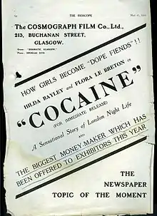 Cocaine is a 1922 British crime film directed by Graham Cutts and starring Hilda Bayley, Flora Le Breton, Ward McAllister and Cyril Raymond. It depicts the distribution of cocaine by gangsters through a series of London nightclubs and the revenge a man seeks after his daughter's death.