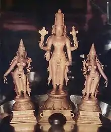 The main idol of Venkateswara, his consorts, Sreedevi and Bhoodevi on his either sides and he is placed on the top of the Simhasan. Utsav Murti with consorts in the middle step, Utsav Lakshmi at the lower step and Saligrama are on the lowest step.