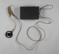 ALDs come in many forms, such as neckloops,[22] pens,[23] and specialist battery pack covers.[24] Modern ALDs are usually able to receive sound from any Bluetooth device, including phones and computers, before transmitting it wirelessly to the audio processor. Most cochlear implants are also compatible with older ALD technology, such as a telecoil.[25]