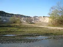 The earliest chalk pits were dug by hand with the lime kilns close by. As the chalk pits became deeper, workmen would be suspended with ropes from the top of the cliff, breaking the chalk by hand.[4] It was not until the 1940s that explosives were used to break the chalk out of the quarry face.[11] Blasting took place two or three times per week, often on Sunday mornings[11] and provoked regular complaints from the residents of Cocking village, particularly regarding cracked ceilings and broken windows.[12][13]