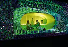 Cocoon was opened on 18 July 2004 inside a newly built concrete office building, named U.F.O. (Unbekannter Frankfurter Osten)[1] constructed by Dietz Joppien Architekten in the industrial east of Frankfurt. It was the successor of the Omen club. The designer of the club interior was the company 3deluxe from Wiesbaden. It was an investment of several million Euros (10 million just for the design by the company 3deluxe). The sound system by Steve Dash cost 700.000 Euros.[2]