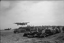 The airfield was built during World War II to support Allied aircraft in the war against Japan. Two airstrips were built, and three bomber squadrons were moved to the islands to conduct raids against Japanese targets in Southeast Asia and to provide support during the planned re-invasion of Malaya and reconquest of Singapore. The first aircraft to arrive were Supermarine Spitfire Mk VIIIs of No. 136 Squadron RAF.[3] They included some B-24 Liberator bombers from No. 321 (Netherlands) Squadron RAF (members of exiled Dutch forces serving with the Royal Air Force), which were also stationed on the islands.