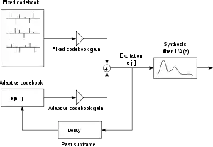 where is the fixed (a.k.a. stochastic or innovation) codebook contribution and is the adaptive (pitch) codebook contribution. The fixed codebook is a vector quantization dictionary that is (implicitly or explicitly) hard-coded into the codec. This codebook can be algebraic (ACELP) or be stored explicitly (e.g. Speex). The entries in the adaptive codebook consist of delayed versions of the excitation. This makes it possible to efficiently code periodic signals, such as voiced sounds.