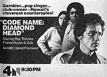 Code Name: Diamond Head is a 1977 American spy film starring Roy Thinnes[1] as an undercover counterintelligence officer known as Diamond Head whose mission is to stop a rogue double agent from stealing the formula for a new chemical weapon.[2] Originally filmed as a pilot for a new television drama (which was never picked up by the networks), it was eventually used for The NBC Monday Movie on U.S. broadcast network NBC. [3][4]