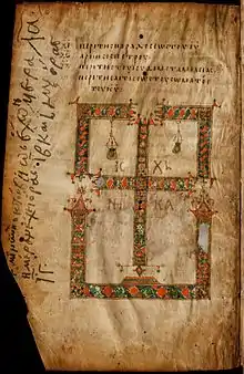 It contains tables of the κεφαλαια (tables of contents) before each Gospel, and the text is divided according to the κεφαλαια (chapters), the numbers of which are placed in the margins.[5]: 132 The chapters are divided into Ammonian Sections with references to the Eusebian Canons (written below the Ammonian Section numbers), along with harmonising references to other Gospels at the foot of the pages,[5]: 132 although full references to all parallel texts are given in the margins and the tables are thus superfluous.[3] The initial letters at the beginning sections stand out on the margin as in codices Alexandrinus and Ephraemi Rescriptus.[5]: 132 The page margins also contain the names of Feast days and their lecton references, together with other liturgical notes.[5]: 132