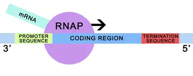 In DNA, the coding region is flanked by the promoter sequence on the 5' end of the template strand and the termination sequence on the 3' end. During transcription, the RNA Polymerase (RNAP) binds to the promoter sequence and moves along the template strand to the coding region. RNAP then adds RNA nucleotides complementary to the coding region in order to form the mRNA, substituting uracil in place of thymine.[12] This continues until the RNAP reaches the termination sequence.[12]