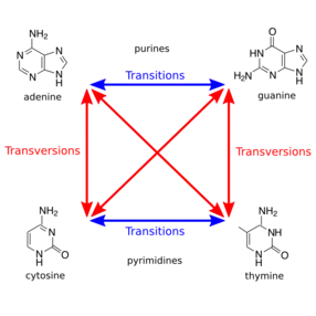 GC-rich areas are also where the ratio point mutation type is altered slightly: there are more transitions, which are changes from purine to purine or pyrimidine to pyrimidine, compared to transversions, which are changes from purine to pyrimidine or pyrimidine to purine. The transitions are less likely to change the encoded amino acid and remain a silent mutation (especially if they occur in the third nucleotide of a codon) which is usually beneficial to the organism during translation and protein formation.[8]