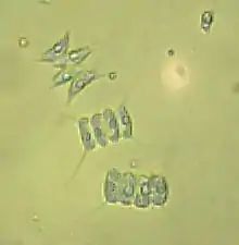 Scenedesmaceae is a family of green algae in the order Sphaeropleales. Scenedesmus algae are commonly found in freshwater plankton. The former family Coelastraceae is considered a synonym of Scenedesmaceae.[1]