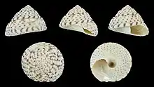 The shell grows to a length of 18 mm. The depressed conical shell is very deeply false-umbilicate and rather thin. The spire has convex outlines;. The apex is acute, and lemon yellow when eroded. The 5 to 5½ whorls are nearly planulate, but the upper margin of each whorl is prominent and projecting beyond the periphery of the preceding. The body whorl is carinated at the periphery. The sculpture above consists of spiral lirae, about 5 to 8 on each whorl, cut into close oblique beads. The interstices are obliquely finely striate, one or two of the broader ones usually with a central riblet. The color of the shell is whitish or yellowish, finely tessellated or articulated with reddish brown The tessellations are formed by the disintegration of narrow radiating stripes, which are on the base frequently continuous. The base of the shell is nearly flat, with seven or eight concentric close fine lines, which are crenulated in a peculiarly irregular manner by distinct short oblique impressed marks. The interstices are finely radiately striate. The subrhomboidal aperture is smooth within. The columella is oblique, nearly straight, with an obsolete, scarcely perceptible fold above, inserted upon the side of the umbilicus, not in its center. The smooth umbilical area is white or yellow. The false-umbilicus is deep and narrow, but partly filled by a white callus, not tapering to a point.[3] Specimens from rocky shores are often eroded and encrusted with coralline algae, while those from shell, gravel, or cobble substrata are usually clean. Primarily a grazer of hard surfaces, most abundant among beds of bivalves. Also occurs in tidal channels at the mouths of harbours, where it grazes over empty shells of pipis.[4]