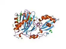 In molecular biology, the Cofactor transferase family is a family of protein domains that includes biotin protein ligases, lipoate-protein ligases A, octanoyl-(acyl carrier protein):protein N-octanoyltransferases, and lipoyl-protein:protein N-lipoyltransferases.[2] The metabolism of the cofactors Biotin and lipoic acid share this family. They also share the target modification domain (Pfam PF00364), and the sulfur insertion enzyme (Pfam PF04055).