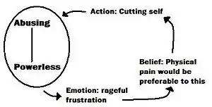 The CAT practitioner aims to work with the patient to identify procedural sequences; chains of events, thoughts, emotions and motivations that explain how a target problem (for example self-harm) is established and maintained. In addition to the procedural sequence model, a second distinguishing feature of CAT is the use of reciprocal roles (RRs). These identify problems as occurring between people and not within the patient. RRs may be set up in early life and then be replayed in later life; for example someone who as a child felt neglected by parents perceived as abandoning might be vulnerable to feelings of abandonment in later life (or indeed neglect themselves).[1]: 244–245