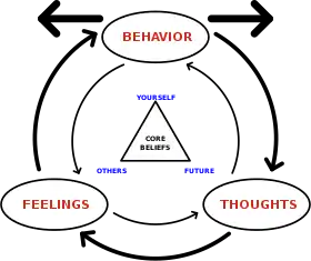 ![]() The triangle in the middle represents CBT's tenet that all humans' core beliefs can be summed up in three categories: self, others, future. | |