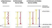 Coherent Raman scattering (CRS) microscopy is a multi-photon microscopy technique based on Raman-active vibrational modes of molecules. The two major techniques in CRS microscopy are stimulated Raman scattering (SRS) and coherent anti-Stokes Raman scattering (CARS). SRS and CARS were theoretically predicted and experimentally realized in the 1960s.[1][2][3] In 1982 the first CARS microscope was demonstrated.[4] In 1999, CARS microscopy using a collinear geometry and high numerical aperture objective were developed in Xiaoliang Sunney Xie's lab at Harvard University.[5] This advancement made the technique more compatible with modern laser scanning microscopes.[6] Since then, CRS's popularity in biomedical research started to grow. CRS is mainly used to image lipid, protein, and other bio-molecules in live or fixed cells or tissues without labeling or staining.[7] CRS can also be used to image samples labeled with Raman tags,[8][9][10] which can avoid interference from other molecules and normally allows for stronger CRS signals than would normally be obtained for common biomolecules. CRS also finds application in other fields, such as material science[11] and environmental science.[12]