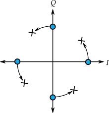 Example of QPSK carrier recovery phase error causing a fixed rotational offset of the received symbol constellation, X, relative to the intended constellation, O.