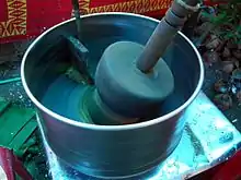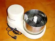 A wet grinder is a food preparation appliance used for grinding food grains to produce batter.[5] Batter is used extensively in South Indian cuisine for preparation of popular dishes such as dosa, idly, vada, appam and paniyaram.[6][7][8][9][10] It consists of granite stones which rotate inside a metal drum with the help of an electric motor and the food grains get crushed between the stone and drum.[11]