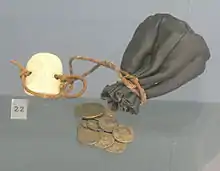 A purse or pouch (from the Latin bursa, which in turn is from the Greek βύρσα, býrsa, oxhide),[1] sometimes called coin purse for clarity, is a small money bag or pouch, made for carrying coins. In most Commonwealth countries it is known simply as a purse, while "purse" in the United States usually refers to a handbag. "Purse" can also be a synonym to bursary (which has the same origin), i.e. a monetary prize in a competition.[2]