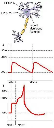 Coincidence detection relies on separate inputs converging on a common target. Consider a basic neural circuit with two input neurons, A and B, that have excitatory synaptic terminals converging on a single output neuron, C (Fig. 1). If each input neuron's EPSP is subthreshold for an action potential at C, then C will not fire unless the two inputs from A and B are temporally close together. Synchronous arrival of these two inputs may push the membrane potential of a target neuron over the threshold required to create an action potential. If the two inputs arrive too far apart, the depolarization of the first input may have time to drop significantly, preventing the membrane potential of the target neuron from reaching the action potential threshold. This example incorporates the principles of spatial and temporal summation. Furthermore, coincidence detection can reduce the jitter formed by spontaneous activity. While random sub-threshold stimulations by neuronal cells may not often fire coincidentally, coincident synaptic inputs derived from a unitary external stimulus will ensure that a target neuron fires as a result of the stimulus.
