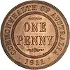 Penny (1d) | 30.8 mm | 9.45 g | Portrait of King George V. Designed by Sir E. B. Mackennal. | At centre within a circle of beads, the denomination "ONE PENNY" in three lines above a plain scroll; around the circle of beads, "COMMONWEALTH OF AUSTRALIA" and date. Designed by W. H. Blackmore. | 1911 | 1911–1936 | |||