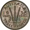 Portrait of King George VI. Designed by Thomas H. Paget. | Three ears of wheat held by a curved ribbon, AUSTRALIA", below divided into two by the stalks of the wheat "THREE PENCE", above, across the middle of the coin the date divided into two by the ears. Designed by George Kruger Gray. | 1938 | 1938–1944 | ||||||