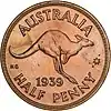 Kangaroo facing right, "AUSTRALIA" above and "HALF PENNY" below, date above denomination. Designed by George Kruger Gray. | 1939 | 1939–1952 | ||||||||