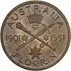 A scepter and sword crossing below a crown and above the Federation Star with the stars of the Southern Cross around, "AUSTRALIA" above, "FLORIN" below and split into two parts by a star, to left "1901" and to right "1951". Designed by William Leslie Bowles. | 1951 | 1951 | ||||||||