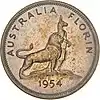 A lion and a kangaroo standing together on a curved ground line facing right, "AUSTRALIA FLORIN" above, below in exergue, "1954". Designed by William Leslie Bowles. | 1954 | 1954 | ||||||||