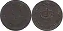 | 1 ban | 15 mm | 1 g | copper 95%, tin 4%, zinc 1% | Smooth | Value, year of minting, ROMANIA, coat of arms | CAROL I REGE AL ROMANIEI ("Carol I, King of Romania") | 1900 | |||