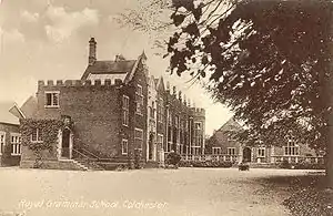 Growth continued through the world wars, with 700 boys by 1947 and five scholarships for pupils to pursue university education. An outdoor swimming pool was constructed in the 1920s[6] and remains in use. In 1966 Labour-controlled Colchester Borough Council put forward proposals to close Colchester Royal Grammar School and Colchester County High School and move to a comprehensive system,[8] but this was rejected by Essex County Council.[9] The educational expansion of the 1960s allowed the construction of new classrooms and a gymnasium.