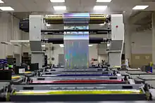 Using a standard printing plate, an image is printed onto a substrate with the use of an ultraviolet-curable cold foil adhesive. An ultraviolet dryer then cures the adhesive, which becomes tacky. Foil spools from an unwind and is nipped to a substrate. Foil sticks to the tacky adhesive on the substrate, and an image with a bright foil surface is created.[1] Foil that does not adhere to the adhesive remains on a thin polyester liner, and waste is directed to a rewind spool. Because the adhesive is applied on press like a conventional ink, no expensive stamping die has to be created.[2]