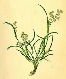 In the genus Coleanthus, Coleanthus subtilis is the sole species.[29] The genus belongs to the Poeae tribus in the Pooideae subfamily.[20] Due to its significant distinctions from other grasses (lack of glumes, erectile tissue, two stamens, and elongated style), some authors place them in their own tribe Coleantheae.[30] Mistakenly, the genus Coleanthus is often assigned six other species that were actually counted in the genus Coleosanthus of the daisy family. These species are now classified as belonging to the genus Brickellia.[18]