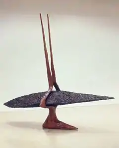 In the later 1980s, Sterritt shifted toward work with smoother surfaces and restrained color, that some writers compare favorably to the work of Martin Puryear or Louise Bourgeois.[8][1] She also undertook greater compositional challenges and expression of movement, that critic Colin Gardner wrote "synthesized classical balance with rugged, idiosyncratic kinesis,"[39] such as Full Quintet (1985),[34] Endear (1987), or Pike: For Earl the Pearl[40] (1988).[41][32] Others recognized greater psychological tenderness and a "quasi-humorous pathos" in her ungainly, "lovable ugly ducklings,"[41] such as the swan-like Flush (1991), which features two forms in relation to explore issues of sexuality and desire, including separation and union, embrace and entrapment.[32][42][3]