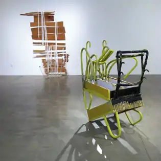 Sterritt began incorporating found furniture and recognizable objects in her work in the 2000s, subverting the "form follows function" dictum in witty, "towering agglomerations" that suggested plants, animals or hybrids (e.g., Daddy-O,[46] 2006).[26][27][47] Her process has been described as resembling a "three-dimensional journal" with each decision and part "unusually transparent," the latter category creating a split mindset in viewers between the integrated sculptures and the disparate, often recognizable, components.[6] The juxtaposition of mass-produced and natural objects opened her work to unpredictable narratives and metaphors investigating the uneasy balance between nature and the built environment in works like One & Nine & Five & Three[48] (2004–05) or Diagramme de Navigation de Mon Coeur (2005), which was described as a "Tatlinesque tower" whose "organic nervous geometry"[21] seemed a meditation on male/female relationships and the flawed promises of modernist utopianism and consumerist comfort.[1][26][6][15]