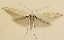 The wingspan is 14–19 mm (0.55–0.75 in).[2] Adults are white with creamy-ochre longitudinal streaks and black speckles. They are on wing from June to August.[3]