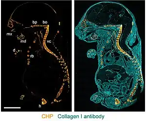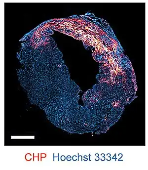 Fluorophore- or biotin-labeled CHPs are used as a staining agent for detecting collagen degradation and denaturation via immunofluorescence and immunohistochemistry applications.[5] CHPs can stain frozen tissue sections, formalin-fixed paraffin embedded (FFPE) sections,[5] as well as fresh tissues.[14][15] CHP is applicable to tissue specimens from multiple species and a range of diseases, such as myocardial infarction, arthritis, nephritis, and fibrosis.[5]