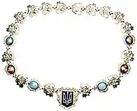 The sign (collar) of the President of Ukraine weighs about 400 grams. President's collar is not obligatory, but most European heads of state have such a decoration: for instance, the President's collar (male jewelry like a female necklace) is one of the symbols of state power in Poland and Bulgaria.[1] Some countries grant another collar to the new head of the state, and the previous one passes to the national museums. An open-work chain with a historical relic – an amulet which, as the legend reads, belonged to Ukrainian Hetman Ivan Mazepa – was among the attributes of the President of Ukraine in exile.
