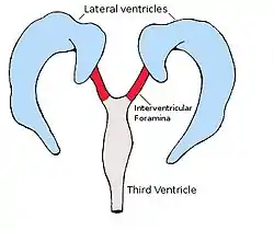 The lateral ventricles, similarly to other parts of the ventricular system of the brain, develop from the central canal of the neural tube. Specifically, the lateral ventricles originate from the portion of the tube that is present in the developing prosencephalon, and subsequently in the developing telencephalon.[5] During the first three months of prenatal development, the central canal expands into lateral, third, and fourth ventricles, connected by thinner channels.[6] In the lateral ventricles, specialized areas – choroid plexuses – appear, which produce cerebrospinal fluid. The neural canal that does not expand and remains the same at the level of the midbrain superior to the fourth ventricle forms the cerebral aqueduct. The fourth ventricle narrows at the obex (in the caudal medulla), to become the central canal of the spinal cord.