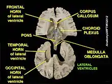 The anterior horn of the lateral ventricle is also known as the frontal horn as it extends into the frontal lobe. The anterior horn connects to the third ventricle, via the interventricular foramen. This portion of the lateral ventricle impinges on the frontal lobe, passing anteriorly and laterally, with slight inclination inferiorly. It is separated from the anterior horn of the other lateral ventricle by a thin neural sheet - septum pellucidum, which thus forms its medial boundary. The boundary facing exterior to the ventricle curvature is formed by the corpus callosum - the floor at the limit of the ventricle is the upper surface of the rostrum (the reflected portion of the corpus callosum), while nearer the body of the ventricle, the roof consists of the posterior surface of the genu. The remaining boundary - that facing interior to the ventricle curvature - comprises the posterior edge of the caudate nucleus. Frontal horn cysts are sometimes found on the frontal horn as a normal variant.[2]