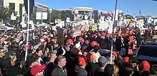 The show takes on a festive tailgate party atmosphere, as thousands of fans gather behind the broadcast set, in view of the show's cameras. Many fans bring flags or hand-painted signs as well, and the school's cheerleaders and mascots often join in the celebration. Crowds at GameDay tapings are known to be quite boisterous and very spirited. Flags seen at the broadcast are not limited to those of the home team; for example, one large Washington State flag can be seen at every broadcast, regardless of the location or the teams involved. The idea began in 2003 on WSU online fan forums and has resulted in the flag, nicknamed "Ol' Crimson," being present at 281 consecutive GameDay broadcasts since 2003.[7][8][9]