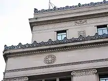 The pilasters of the upper levels have fluting and capitals of ionic composition and support a rather large entablature. Art Deco architecture, well known for its geometric patterns and ornamentation, is demonstrated in the detailed entablature, with a sculpted architrave, dentils on the cornice, and a monel metal trim along the top. Along the frieze are round ornamental metal pieces placed in a rhythmic order between the pilasters. Each entrance is flanked by a slightly protruding cast stone frame decorated with sculpted square shapes, and dentils, and bordered by a spiral, ribbon-shaped cast stone. The monel metal trim on the window frames represents the art deco style of having natural shapes such as flowers or sunbursts, as influenced from the Egyptian and Mayan styles (New York Architecture). As can be observed, the trim is a natural organic shape.