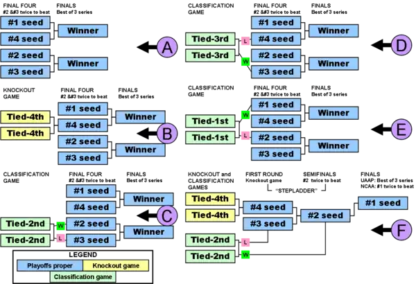 - Diagram F: UAAP Season 70 men's playoffs - UE's sweep in the eliminations gave them an outright finals berth, bypassing the semifinals where they've always been beaten since its inception. La Salle defeated Ateneo on the 2nd seed game, which defeated UST on the first round which had qualified by beating FEU on the 4th seed game. La Salle needed their twice to beat advantage to eliminate Ateneo in the semifinal.