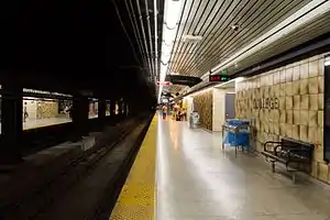 In early 2011 the TTC began work to re-install a double crossover south of the station. The crossover will allow trains to turn back at the station, allowing for more flexibility during emergencies.[9] The crossover had existed from the day the subway opened until the mid-1980s when it was removed due to financial, maintenance and safety concerns and because it was not regularly used.[10] The original crossover was not powered or signaled, meaning that supervisory personnel had to be on scene to manually operate the switches, and ensure safe train passage. On November 21, 2020, Automatic Train Control was activated at College station, allowing the crossover to be remotely operated for train turnbacks.[11]